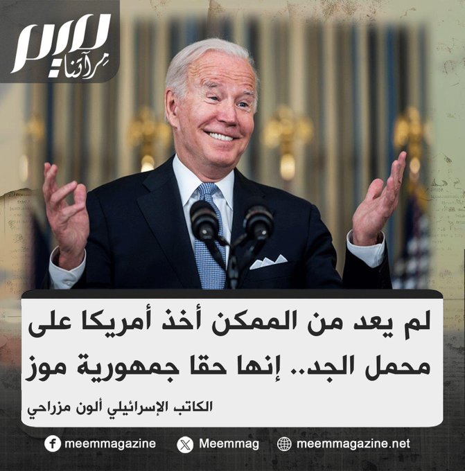 الكاتب الإسرائيلي ألون مزراحي، على تويتر: "لم يعد من الممكن اعتبار الولايات المتحدة دولة جادة في أي قضية. إنها فاسدة ومتضاربة.. لا تتمتع برؤية ولا وضوح ولا خطوط حمر.. إنها حقا جمهورية موز ذات علاقات وحشية".