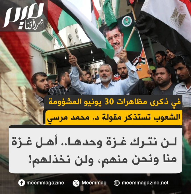 في ذكرى مظاهرات 30 يونيو المشؤومة.. الشعوب تستذكر مقولة د. محمد مرسي: لن نترك غزة وحدها.. أهل غزة منا ونحن منهم، ولن نخذلهم!