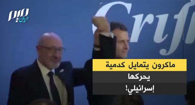 في مشهد عجيب.. الرئيس الفرنسي إيمانويل ماكرون يظهر وهو يتمايل كدمية يحركها رئيس لجنة الشؤون العامة الإسرائيلية في فرنسا.
