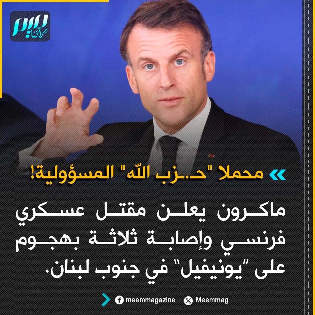 ماكرون يعلن مقتل عسكري فرنسي وإصابة ثلاثة بهجوم على "يونيفيل" في جنوب لبنان قائلا في تغريدة: "كل المؤشرات تفيد بأن المسؤولية تقع على حـ.ـزب الله".