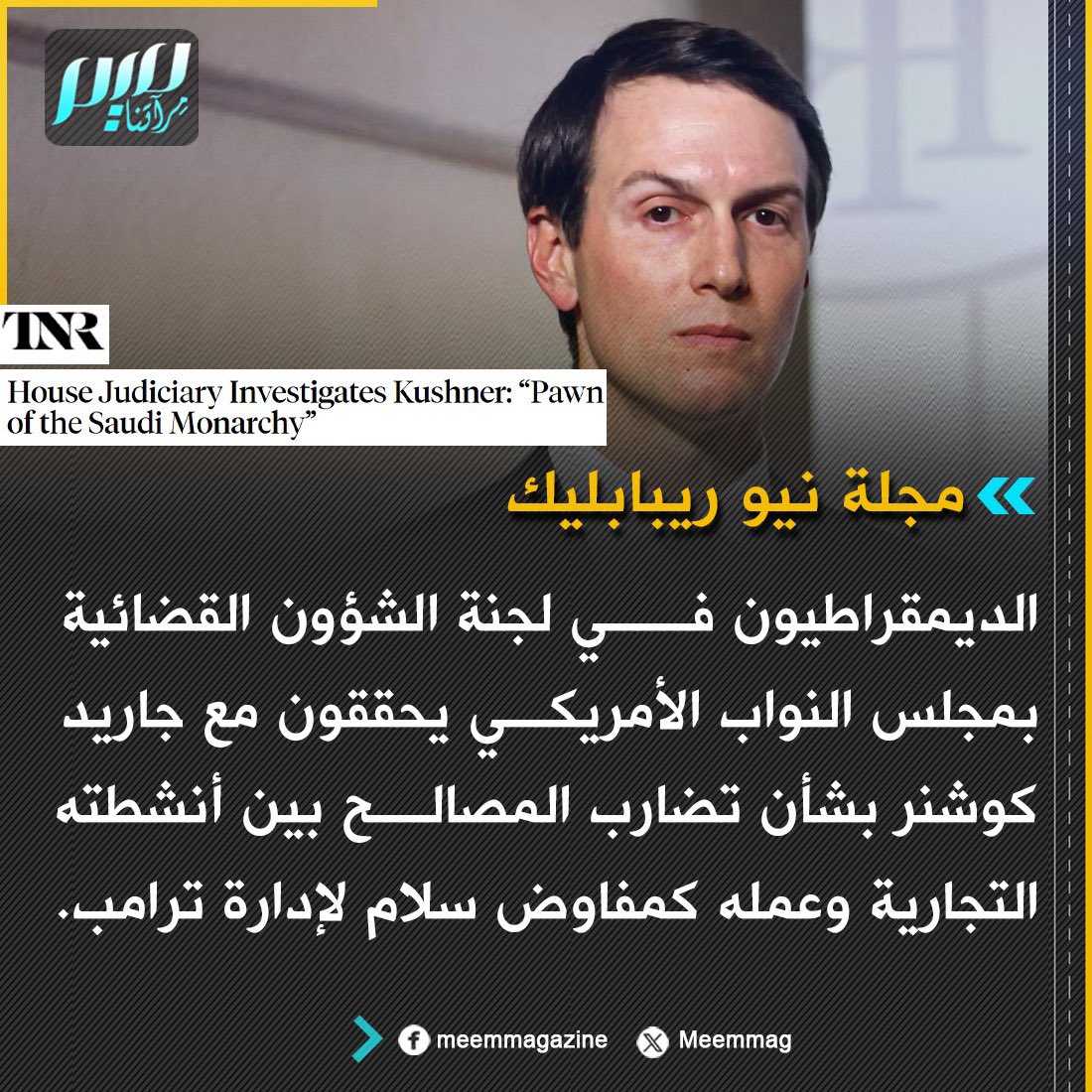مجلة نيو ريبابليك: الديمقراطيون في لجنة الشؤون القضائية بمجلس النواب الأمريكي يحققون مع جاريد كوشنر بشأن تضارب المصالح بين أنشطته التجارية وعمله كمفاوض سلام لإدارة ترامب.