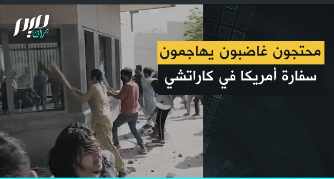 حشود غاضبة تهاجم السفارة الأمريكية في كاراتشي بباكستان وتحاول اقتحامها، بعد انتشار خبر اغتيال علي خامنئي.