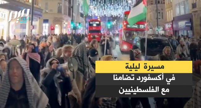 مسيرة ليلية في شوارع أكسفورد في بريطانيا، تضامنا مع الفلسطينيين، وتطالب بمحاسبة إسرائيل لارتكابها إبادة جماعية في غزة.