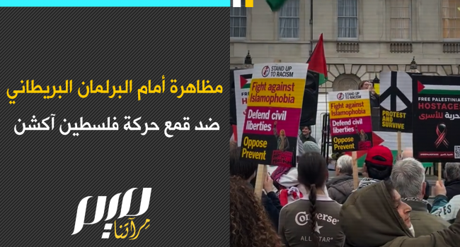 مظاهرة أمام البرلمان البريطاني احتجاجا على قمع حركة "فلسطين آكشن" من سلطات المملكة المتحدة.