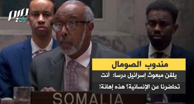 مندوب الصومال لدى الأمم المتحدة أبو بكر ظاهر عثمان يلقن مبعوث إسرائيل درسا: "أن تأتي إلى هذا المكان، وتُلقي علينا محاضرات في الإنسانية والإبادة الجماعية وحقوق الإنسان والاستقلال والديمقراطية، ونحن نعلم ما تفعلونه يوميا، فهذا إهانة صريحة. ولا يمكنني تجاوز ذلك دون أن أرد عليه."