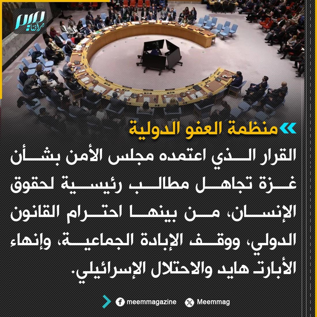 منظمة العفو الدولية: القرار الذي اعتمده مجلس الأمن بشأن غزة تجاهل مطالب رئيسية لحقوق الإنسان، من بينها احترام القانون الدولي، ووقف الإبادة الجماعية، وإنهاء الأبارتهايد والاحتلال الإسرائيلي.