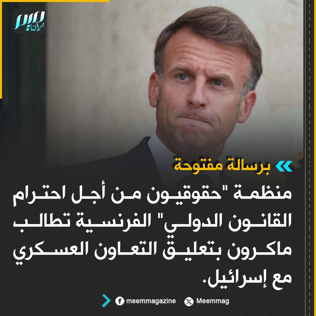 منظمة "حقوقيون من أجل احترام القانون الدولي" الفرنسية تطالب ماكرون بتعليق التعاون العسكري مع إسرائيل.