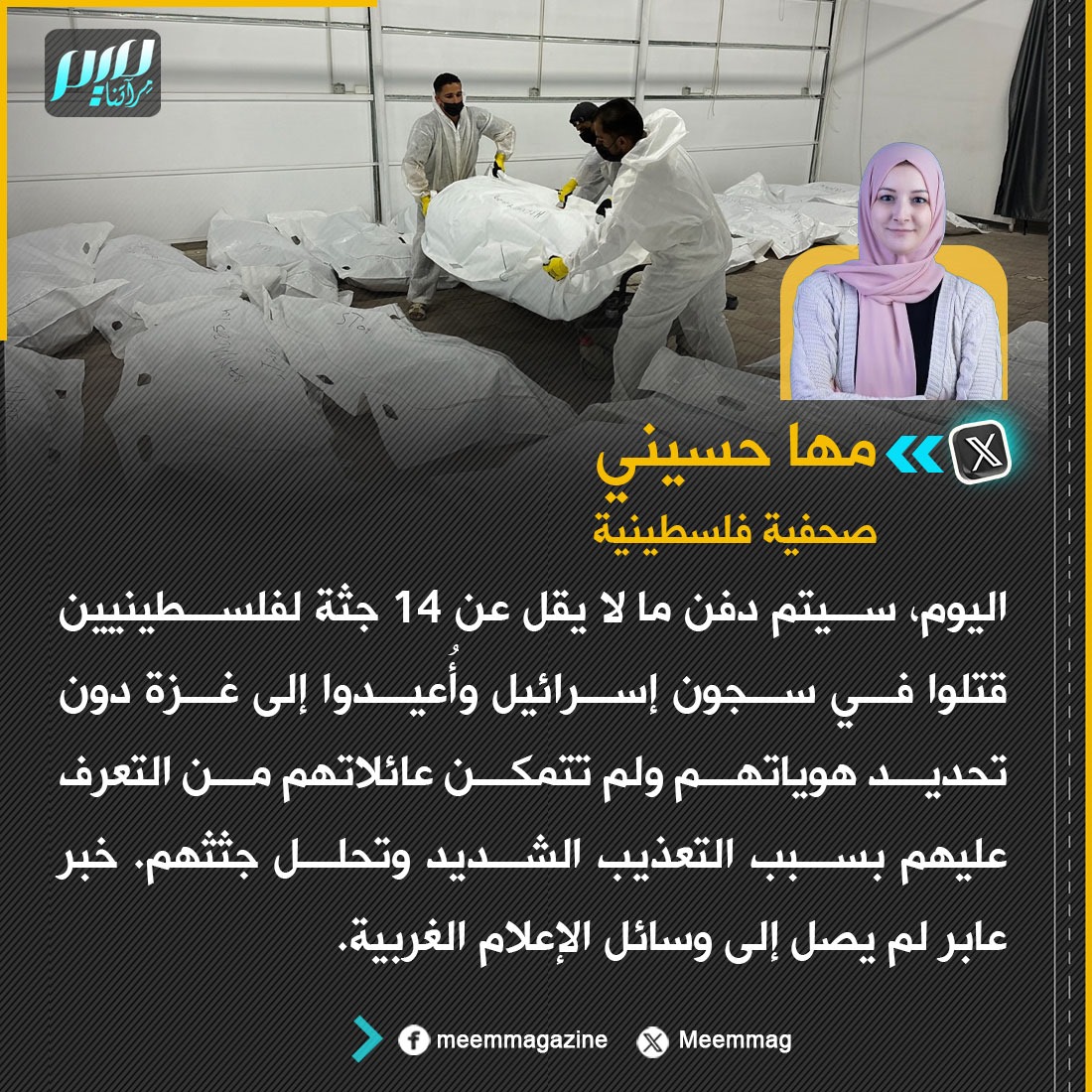 مها حسيني: اليوم، سيتم دفن ما لا يقل عن 14 جثة لفلسطينيين قتلوا في سجون إسرائيل وأُعيدوا إلى غزة دون تحديد هوياتهم ولم تتمكن عائلاتهم من التعرف عليهم بسبب التعذيب الشديد وتحلل جثثهم. خبر عابر لم يصل إلى وسائل الإعلام الغربية.