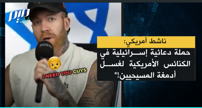 ناشط أمريكي يكشف حملة إسرائيلية بملايين الدولارات تستهدف الكنائس والفعاليات المسيحية في الساحل الغربي الأمريكي لتعزيز التأييد لإسرائيل والتأثير على المواقف تجاه الفلسطينيين. "هناك صفقة جارية بملايين الدولارات لإنشاء حملة دعائية لصالح إسرائيل، موجهة لجميع الكنائس المسيحية في الساحل الغربي الأمريكي تهدف إلى غسل أدمغة المسيحيين ليصبحوا أكثر تأييدا لإسرائيل وعداء للفلسطينيين. استيقظوا."