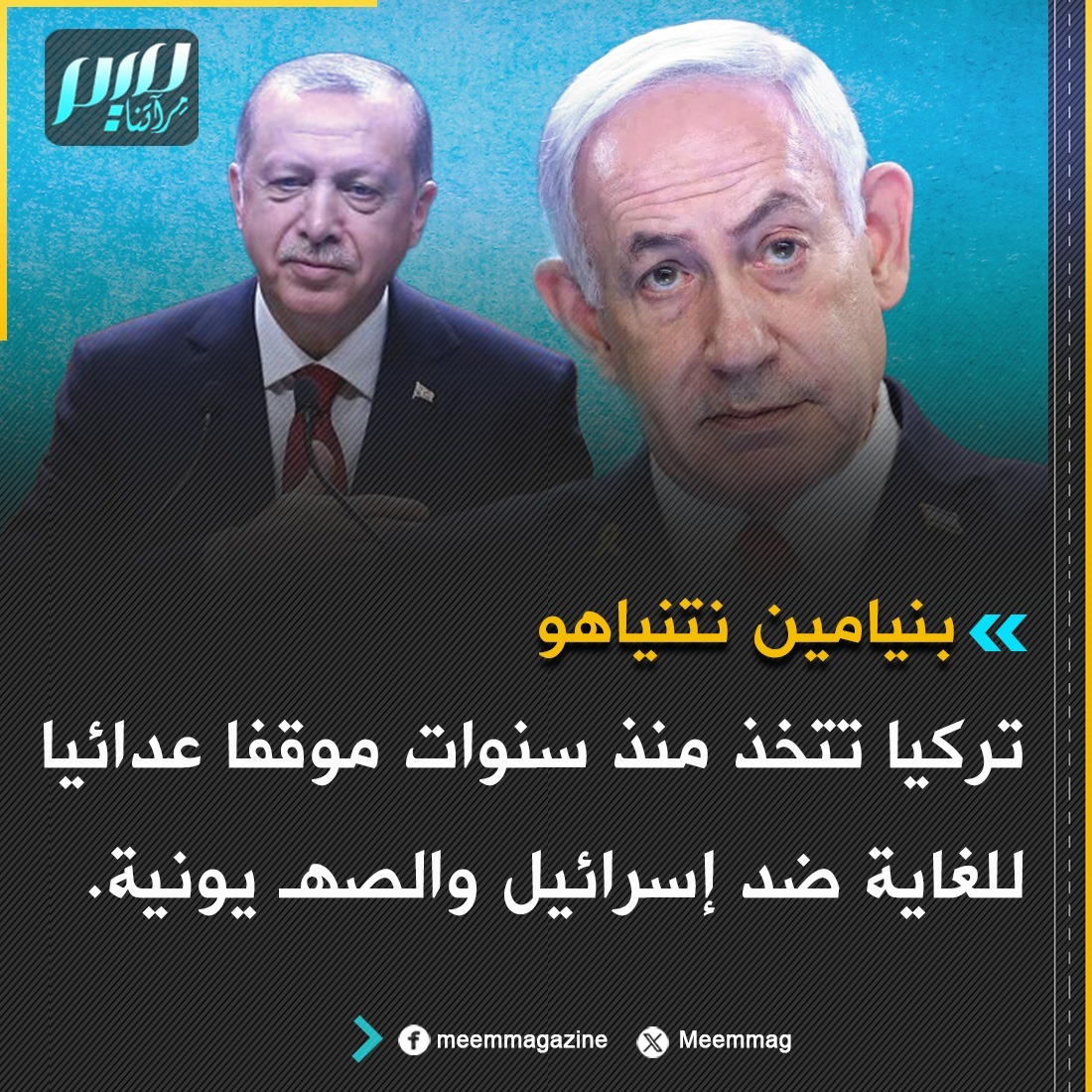 رئيس الوزراء الإسرائيلي بنيامين نتنياهو، في مقابلة مع صحيفة "جويش نيوز سينديكيت" العبرية: تركيا تتخذ منذ سنوات موقفا عدائيا للغاية ضد إسرائيل والصهيونية.