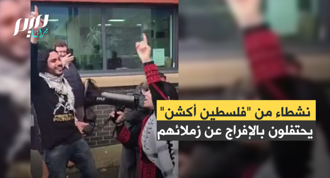 نشطاء من حركة "فلسطين أكشن" يحتفلون بالإفراج عن 11 ناشطا في الحركة، أفرج عنهم القضاء البريطاني بكفالة مالية.
