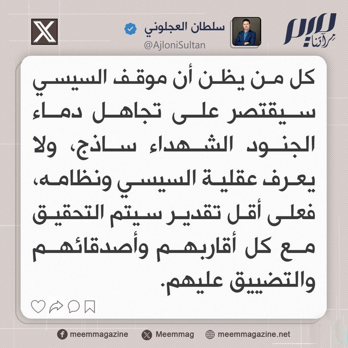 هل تتفق مع العجلوني في أن نظام السيسي سيحقق ويضيق على ذوي وأصدقاء المجندين المصريين، بدلا من تكريمهم؟