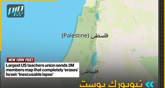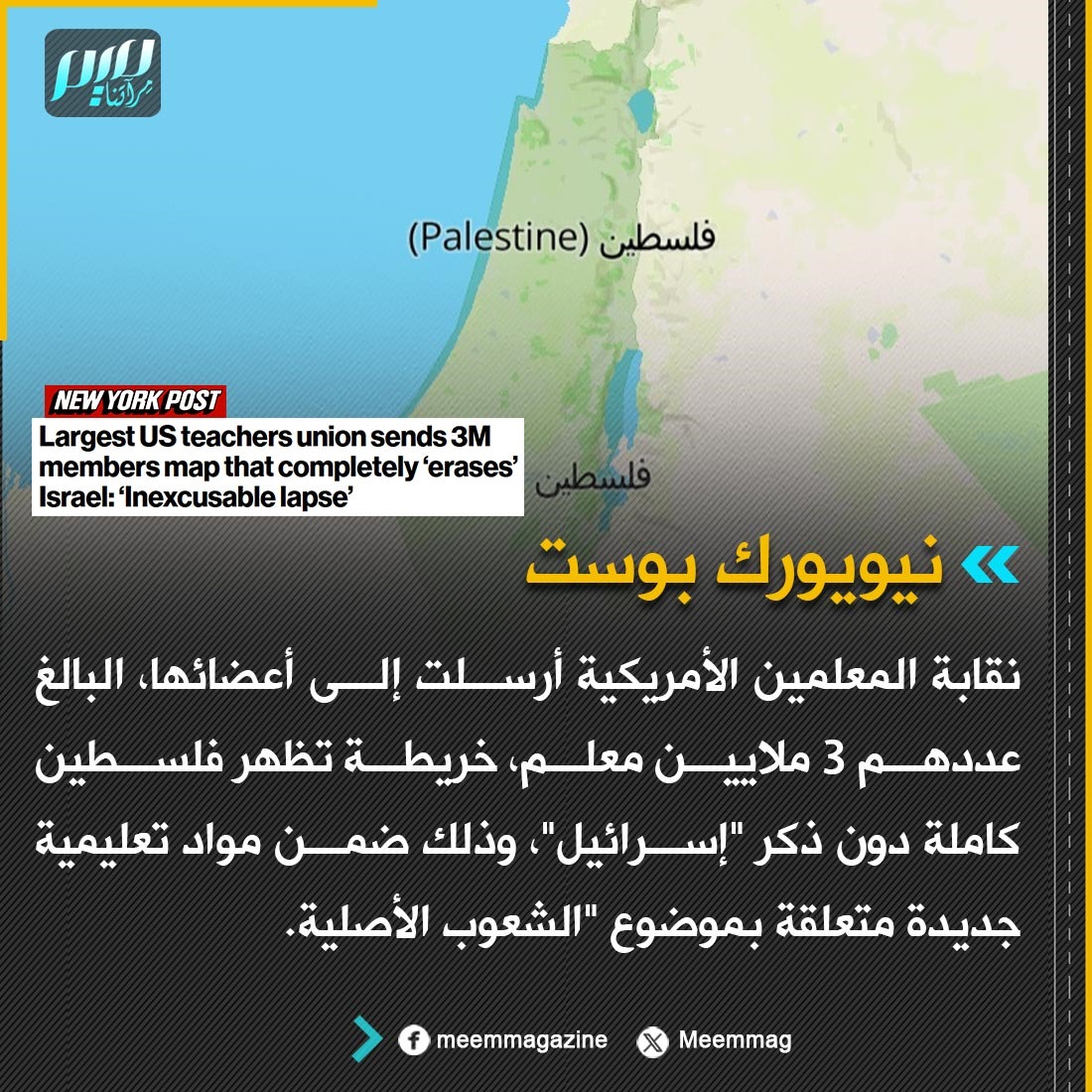 نيويورك بوست: نقابة المعلمين الأمريكية أرسلت إلى أعضائها، البالغ عددهم 3 ملايين معلم، خريطة تظهر فلسطين كاملة دون ذكر "إسرائيل"، وذلك ضمن مواد تعليمية جديدة متعلقة بموضوع "الشعوب الأصلية.