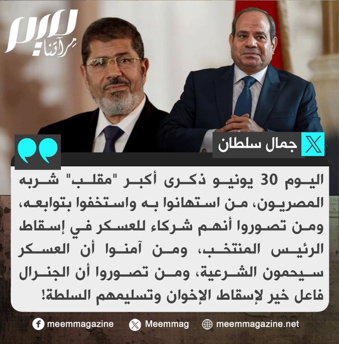 هل تتفق مع سلطان أن اليوم ذكرى أكبر مقلب شربه المصريون بالمظاهرات للإطاحة بشرعية مرسي وتسليم السيسي وعسكره؟