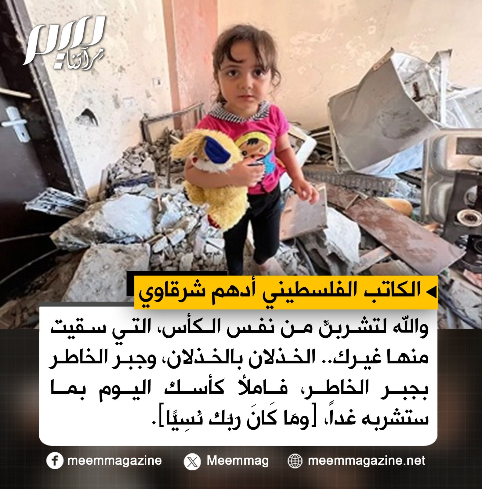 الكاتب الفلسطيني أدهم شرقاوي: والله لتشربنَّ من نفس الكأس، التي سقيتَ منها غيرك.. الخذلان بالخذلان، وجبر الخاطر بجبر الخاطر، فاملأ كأسكَ اليوم بما ستشربه غداً، ﴿ومَا كَانَ رَبُكَ نَسِيًّا﴾.