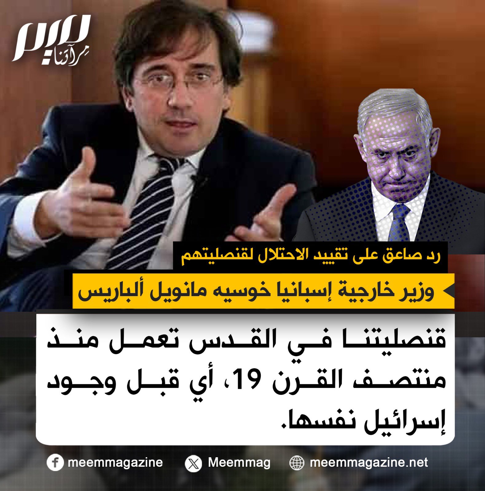 رد صاعق.. "قنصليتنا في القدس تعمل منذ منتصف القرن 19، أي قبل وجود إسرائيل نفسها".. وزير خارجية إسبانيا خوسيه مانويل ألباريس في تعليقه على تقييد تل أبيب لعمل قنصليتهم في فلسطين.