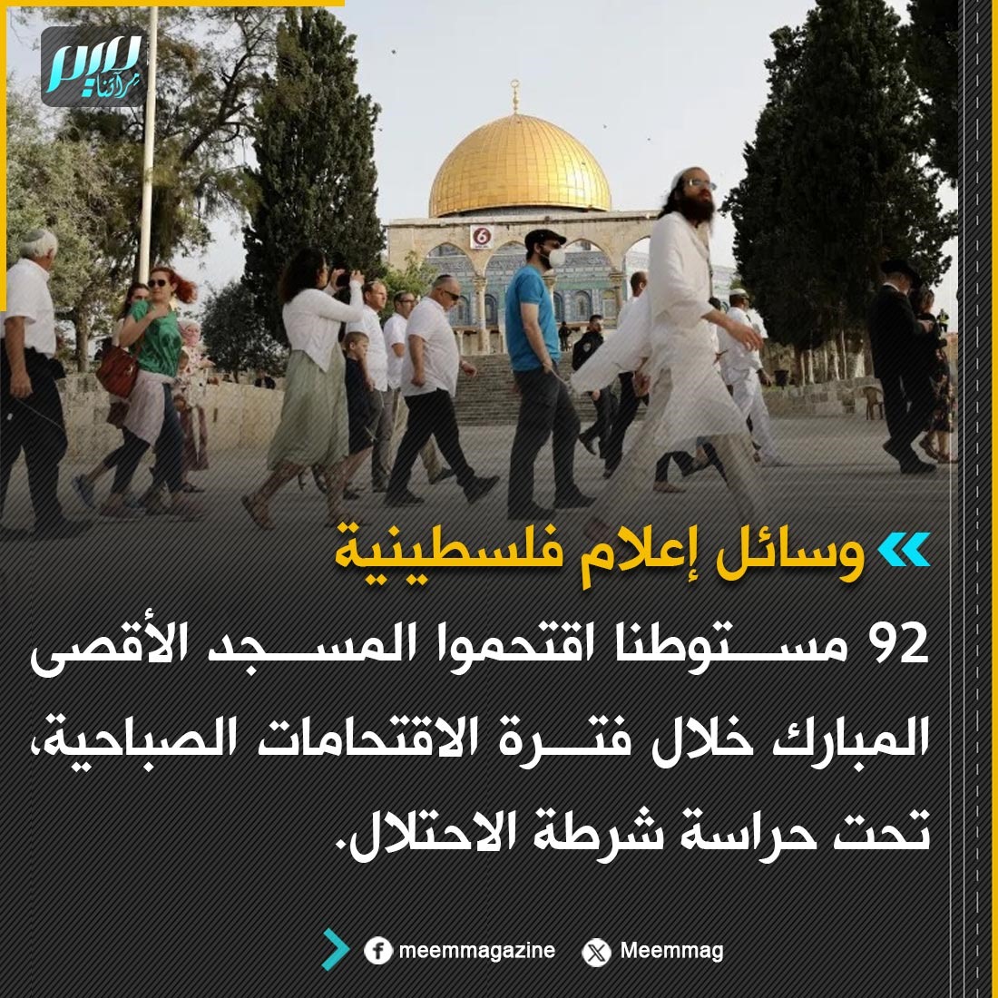 وسائل إعلام فلسطينية: 92 مستوطنا اقتحموا المسجد الأقصى المبارك خلال فترة الاقتحامات الصباحية، تحت حراسة شرطة الاحتلال.