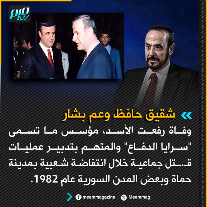 وفاة رفعت الأسد، مؤسس ما تسمى "سرايا الدفاع" والمتهم بتدبير عمليات قـ.ـتل جماعية خلال انتفاضة بمدينة حماة