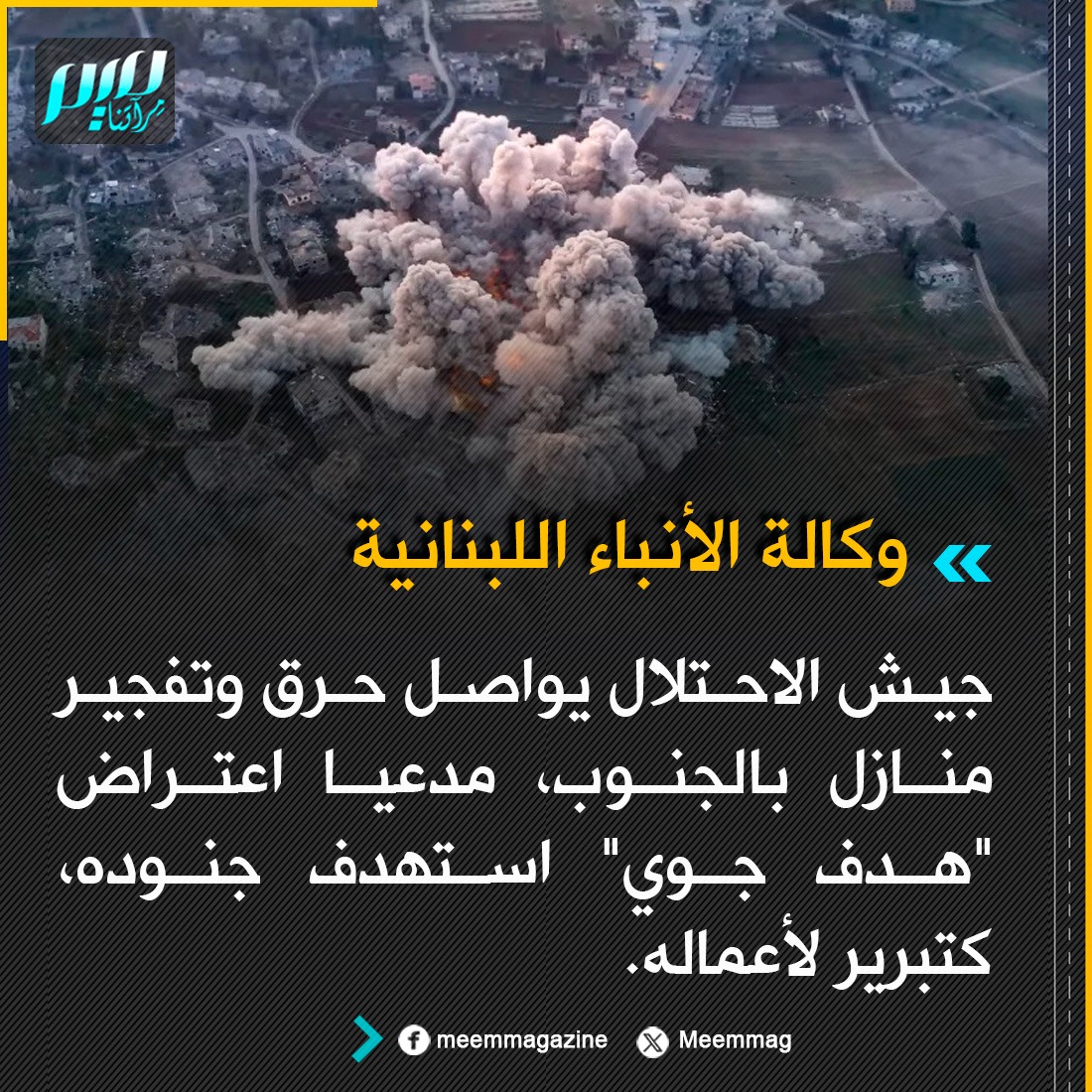 وكالة الأنباء اللبنانية: جيش الاحتلال يواصل حرق وتفجير منازل بالجنوب، مدعيا اعتراض "هدف جوي" استهدف جنوده، كتبرير لأعماله.