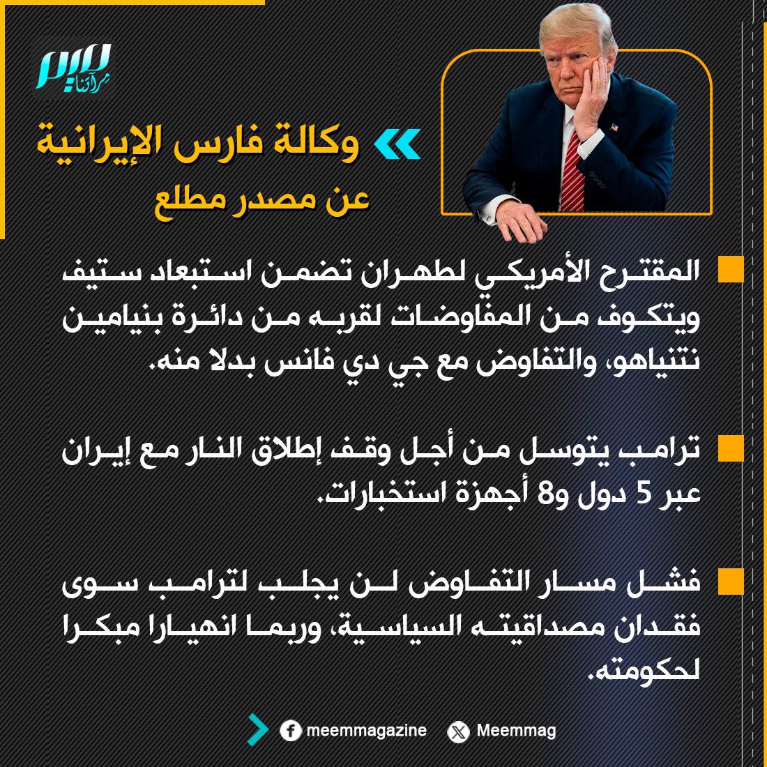 وكالة فارس الإيرانية عن مصدر مطلع: المقترح الأمريكي لطهران تضمن استبعاد ستيف ويتكوف من المفاوضات لقربه من دائرة بنيامين نتنياهو، والتفاوض مع جي دي فانس بدلا منه.