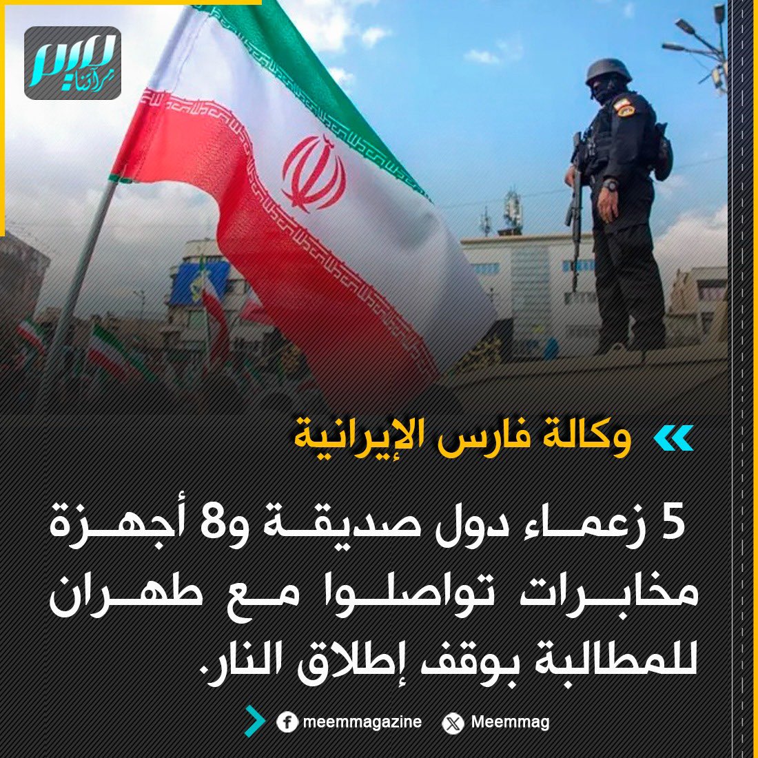 وكالة فارس الإيرانية: 5 زعماء دول صديقة و8 أجهزة مخابرات تواصلوا مع طهران للمطالبة بوقف إطلاق النار.