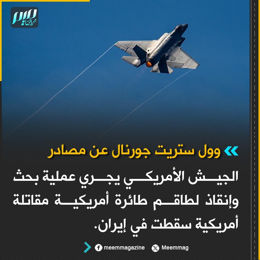 وول ستريت جورنال عن مصادر: الجيش الأمريكي يجري عملية بحث وإنقاذ لطاقم طائرة أمريكية مقاتلة أمريكية سقطت في إيران.