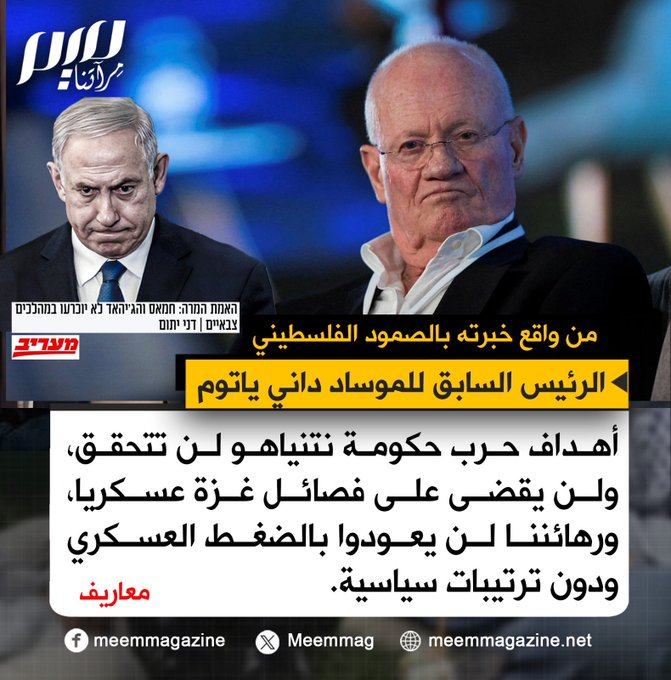 من واقع خبرته بالصمود الفلسطيني.. ياتوم: أهداف حرب حكومة نتنياهو على غزة لن تتحقق، وفصائلها باقية، ورهائننا لن يعودوا بالضغط العسكري ودون ترتيبات سياسية، بحيب تصريحاته لصحيفة "معاريف" العبرية.