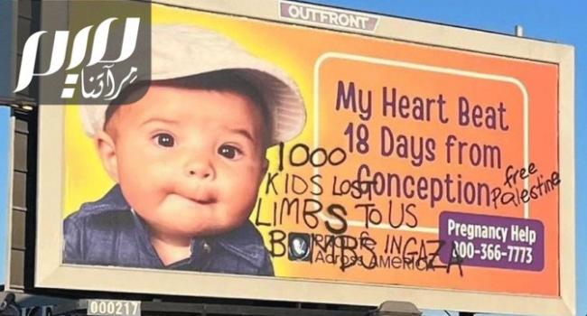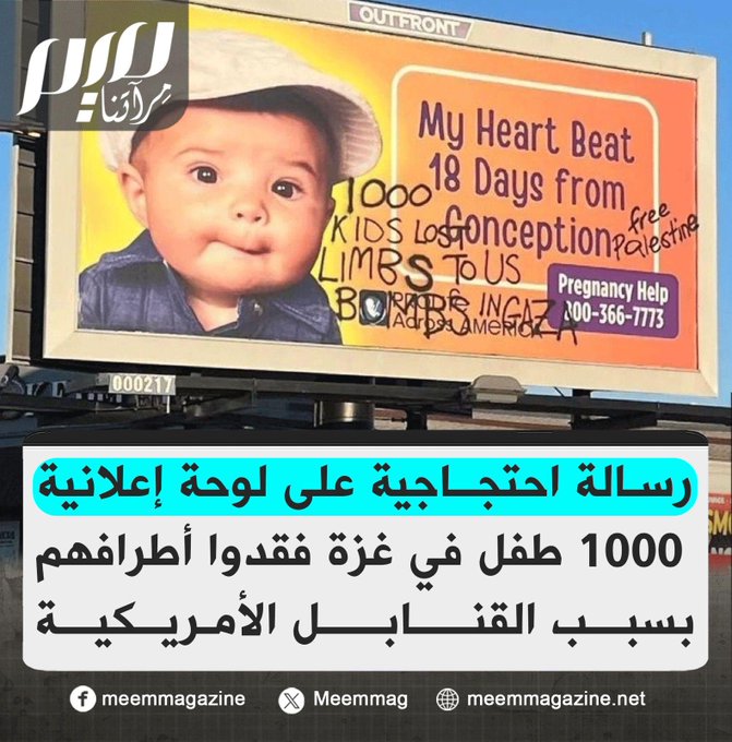 ناشطون مناصرون لفلسطين يخطون رسالة على لوحة إعلانية بمدينة ميدفورد الأمريكية: "1000 طفل في غزة فقدوا أطرافهم بسبب قنابل الولايات المتحدة.